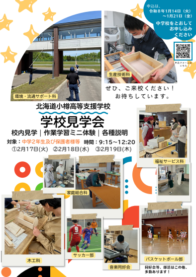 ・今回の学校見学会には多数のお申し込みをいただいております。参加人数が予定よりも多くなっておりますが、来校された中学生の皆様に作業体験ができるように準備しております。皆様の御来校をお待ちしております。